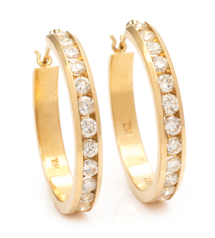 A Pair of 14 Karat Yellow Gold and Diamond Hoop Earrings,