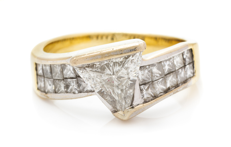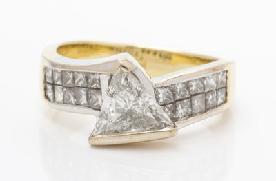 containing one triangular brilliant cut diamond weighing approximately 1.03 carats, and 20 princess cut diamonds weighing approximately 0.40 carat total.Stamp: BW 18K.