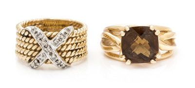 A Collection of 14 Karat Yellow Gold, Diamond and Smokey Quartz Rings,