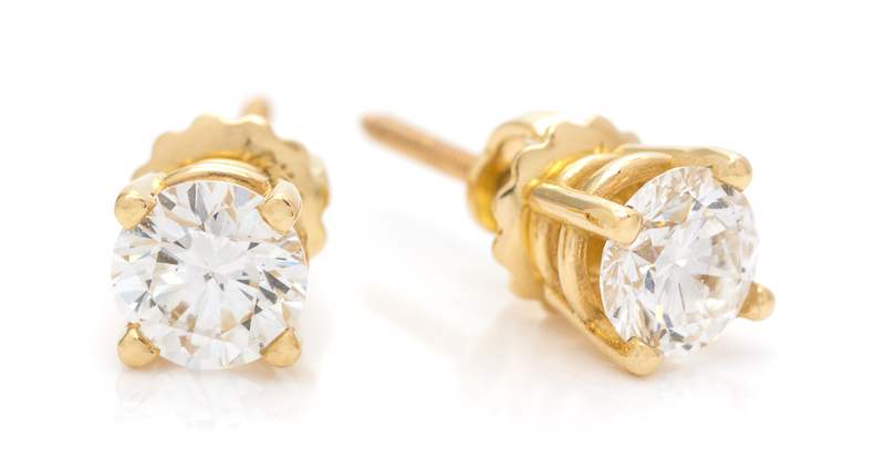 containing two round brilliant cut diamonds weighing approximately 1.24 carat total set into two four prong yellow gold basket settings with screw style posts.Stamp: 14K S.