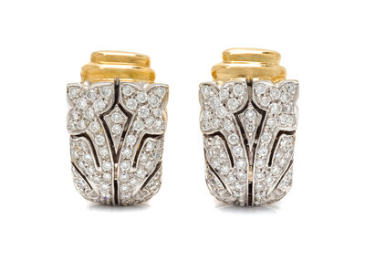 A Pair of 18 Karat Bicolor Gold and Diamond Earclips,