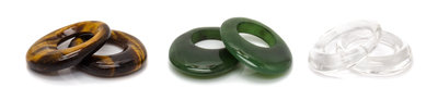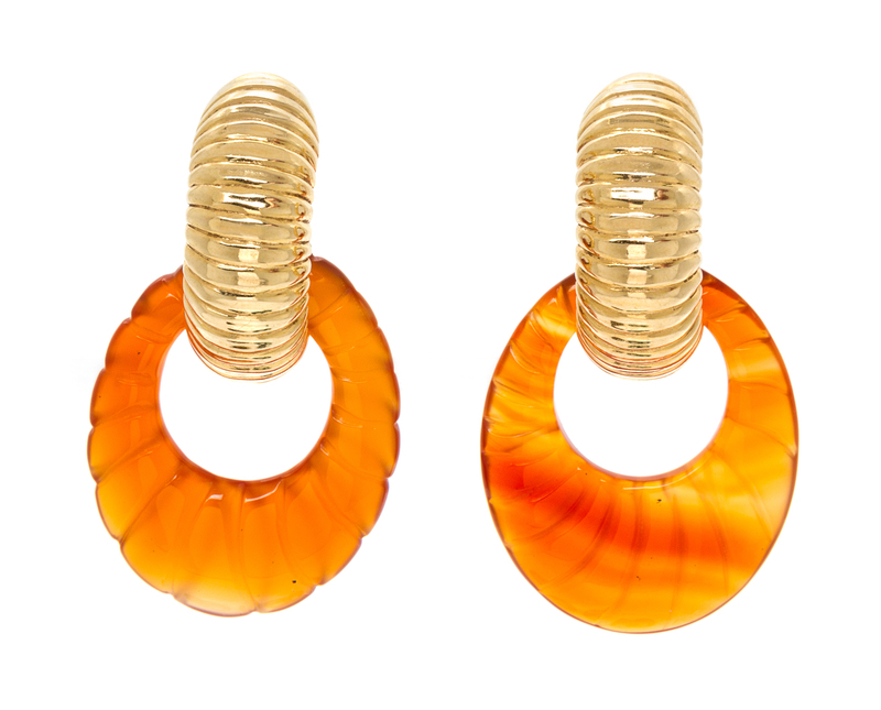 consisting of two rib textured gold earclips together with four pairs of interchangeable carved stone pendants including tiger's eye, nephrite jade, carnelian, and rock crystal.Stamp: AC (maker's mark) 14K.