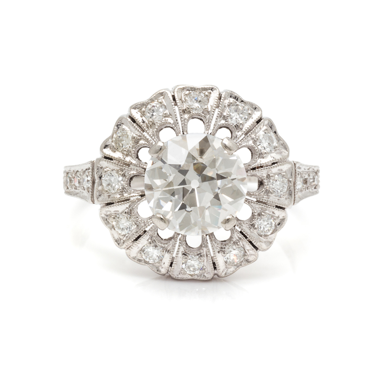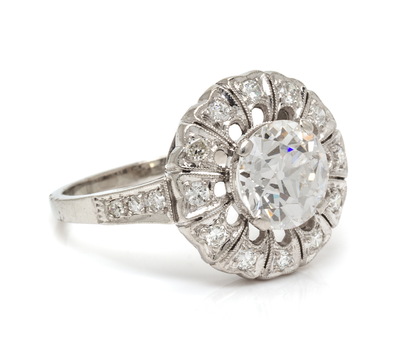 in an open circular design, containing one old European cut diamond weighing approximately 1.93 carats and 18 round brilliant and single cut diamonds weighing approximately 0.33 carat total Stamp: IRIDIUM PLAT.