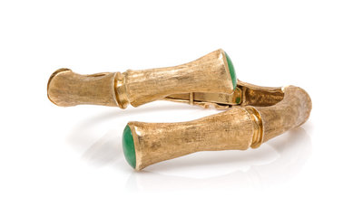 A 14 Karat Yellow Gold and Jade Bamboo Motif Bypass Bracelet,