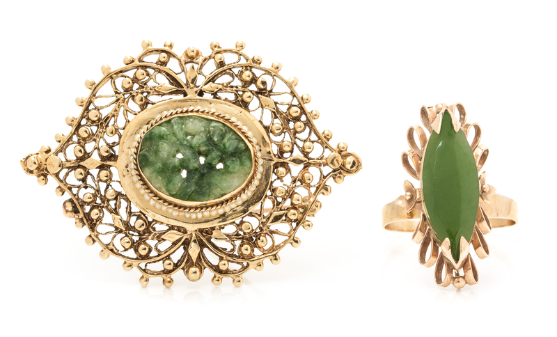 consisting of a brooch containing one oval carved jadeite plaque measuring approximately 15.60 x 11.65 x 3.77 mm surrounded by seed pearls together with a ring containing one marquise mixed cut nephrite jadeite measuring approximately 21.70 x 7.84 x 3.4.60 mm.Ring stamp: 14K.