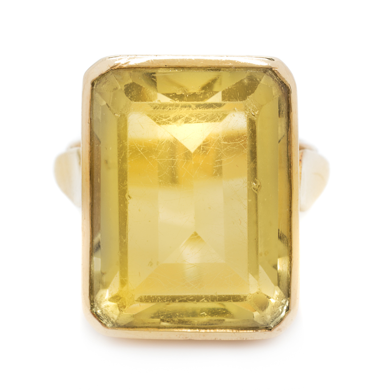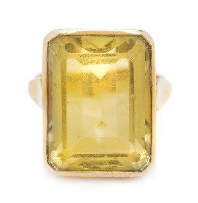 containing one octagonal step cut citrine measuring approximately 20.00 x 15.67 x 9.34 mm, the openwork shoulders accented with leaf motif detail.