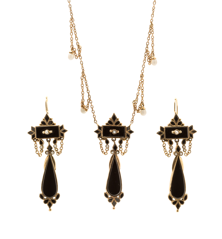 A Victorian Yellow Gold, Onyx and Seed Pearl Mourning Jewelry Demi Parure,