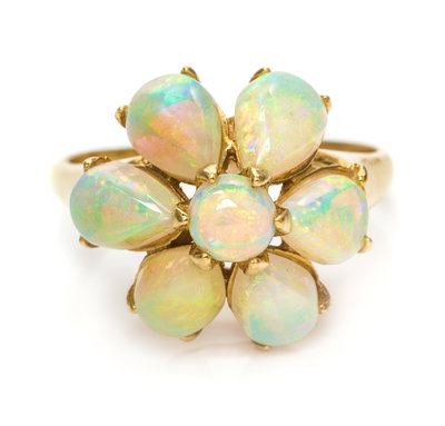 containing six pear shape cabochon cut opals measuring approximately 7.75 x 5.20 mm and one round cabochon cut opal measuring approximately 4.82 mm in diameter. Stamp: 14KEP ITALY.
