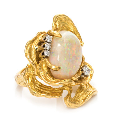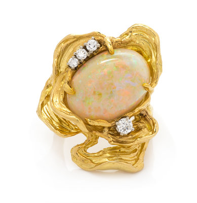 in a textured freeform openwork design, containing one oval cabochon cut white opal measuring approximately 17.26 x 11.73 mm and four round brilliant cut diamonds weighing approximately 0.22 carat total.
