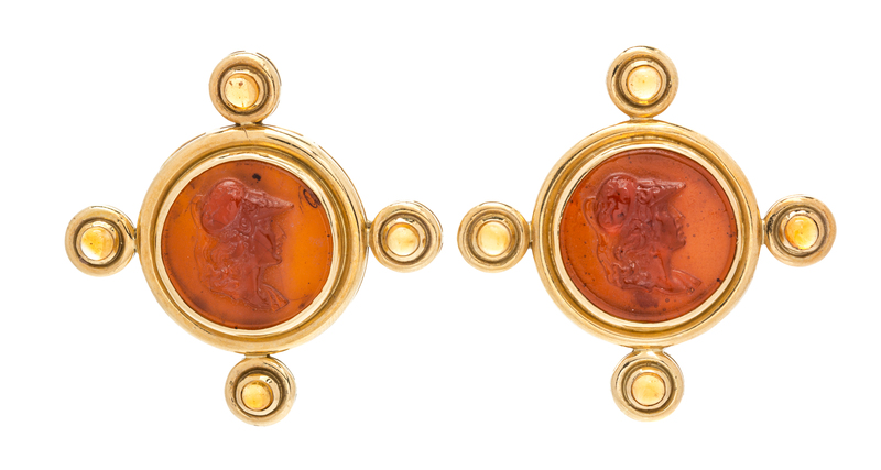 in a fluted circular design accented at the compass points with bezel settings, the earclips containing two brownish orange glass cameos measuring approximately 18.16 mm in diameter and depicting Athena and eight round cabochon cut citrine.Stamp: 18K.
