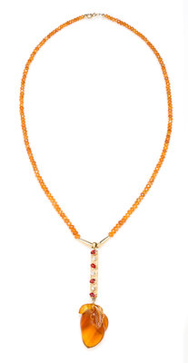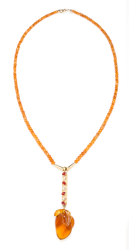 A 14 Karat Yellow Gold, Spessartite Garnet, Amber and Diamond Lavalier Necklace,