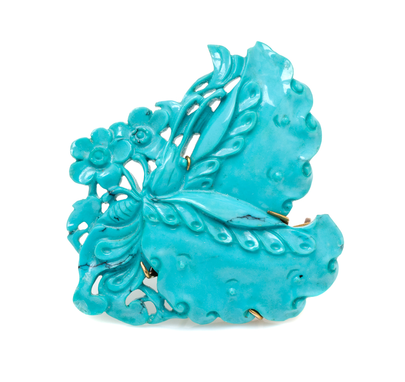 consisting of a detailed turquoise plaque carving of a butterfly amongst flowers, brooch measures approximately 50.00 x 41.00 mm.Stamp: 14K.