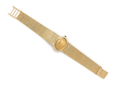 28.00 x 21.50 mm case dimensions, matte gold dial signed LUCIEN PICCARD, applied faceted block numerals, gilt baton hands, textured bezel, oval case, snap on case back, quartz movement, textured mesh link bracelet, box clasp.Stamp: LUCIEN PICCARD 14K 780193.