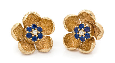 A Pair of 14 Karat Yellow Gold, Sapphire and Diamond Flower Motif Earclips,