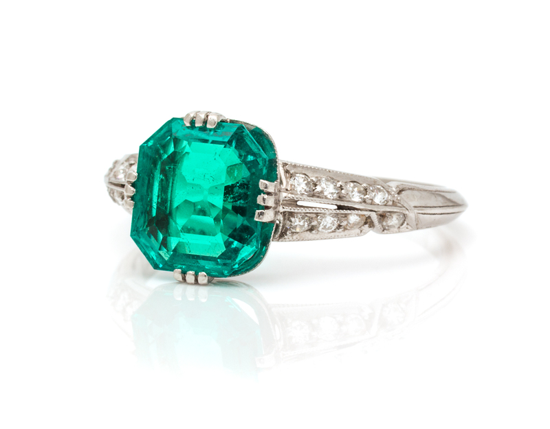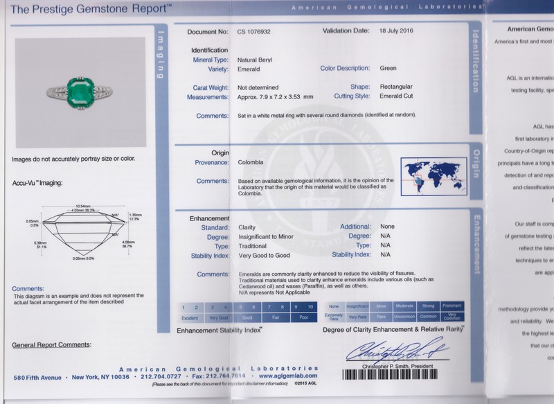 containing one octagonal step cut emerald measuring approximately 7.90 x 7.25 x 3.57 mm and 16 old European and transitional brilliant cut diamonds weighing approximately 0.16 carat total.Stamp: TIFFANY & CO. Accompanied by an American Gemological Laboratories emerald identification and origin certificate number CS 1076932, dated July 18, 2016, stating Mineral Type: Natural Beryl, Variety: Emerald, Origin: Colombia, Clarity Enhancement: Insignificant to Minor, Traditional.