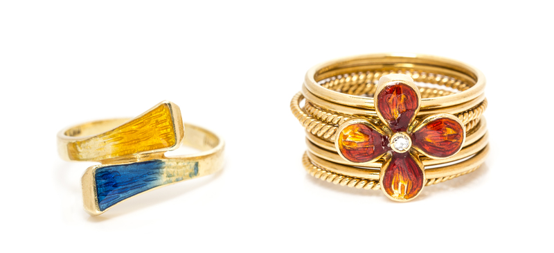 consisting of a yellow gold floral motif ring containing one round single cut diamond and red enamel accents, together with a yellow and blue enamel bypass ring.Stamp: ITALY 18K GUCCI.