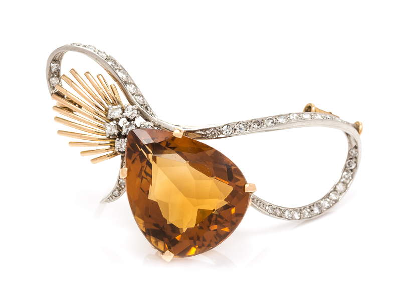 A Retro Rose Gold, Platinum, Citrine and Diamond Brooch,