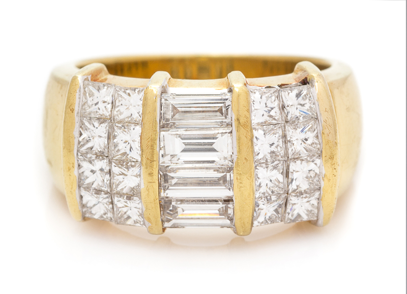 containing four baguette cut diamonds weighing approximately 0.56 carat total and 16 princess cut diamonds weighing approximately 0.72 carat total. Stamp: 18K & (UNEEK).
