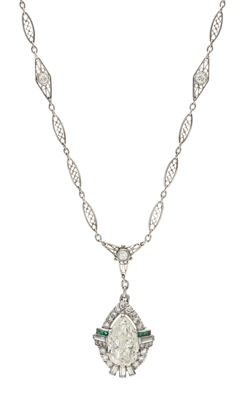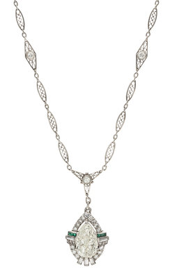An Art Deco Platinum, Diamond and Emerald Lavaliere Necklace,