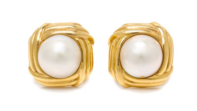 A Pair of 18 Karat Yellow Gold and Mabe Pearl Earclips,
