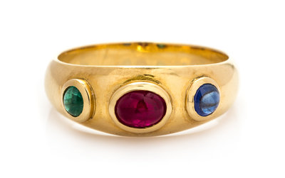 containing one oval cabochon cut ruby, one round cabochon cut sapphire, and one round cabochon cut emerald.Stamp: 750.