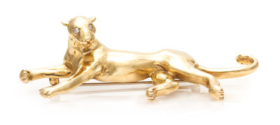 depicting a realistic panther in repose, the eyes containing two round brilliant cut diamonds weighing approximately 0.05 carat total.Stamp: 14KHand inscribed: Rinara.