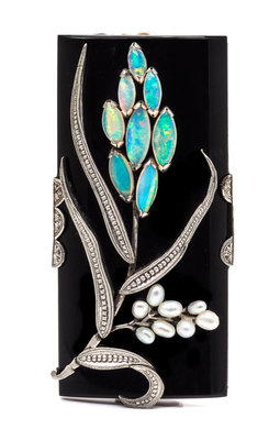 containing one rectangular onyx plaque measuring approximately 58.00 x 28.00 mm, eight marquise shaped cabochon cut opals of weighing approximately 1.60 carats total and eight seed pearls.Stamp: SPM.