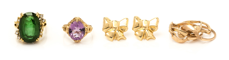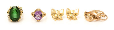 containing one oval mixed cut green tourmaline measuring approximately 19.16 x 13.08 x 9.29 mm and 10 round single cut diamonds weighing approximately 0.20 carat total, including a puzzle ring consisting of four interlocking bands, a 10 karat gold and amethyst ring containing one oval shape brilliant cut amethyst weighing approximately 4.00 carats in an openwork heart design, together with a pair of bow motif earrings.