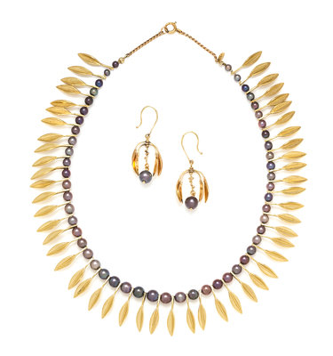 An 18 Karat Yellow Gold and Cultured Pearl Leaf Motif Demi Parure,