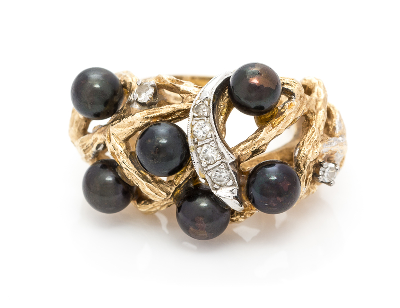 containing six black pearls (origin of color not tested) measuring approximately 5.22 mm and six round single cut diamonds weighing approximately 0.17 carats total.