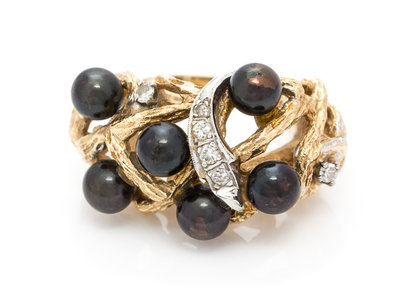 A 14 Karat Yellow Gold, Cultured Pearl and Diamond Ring,