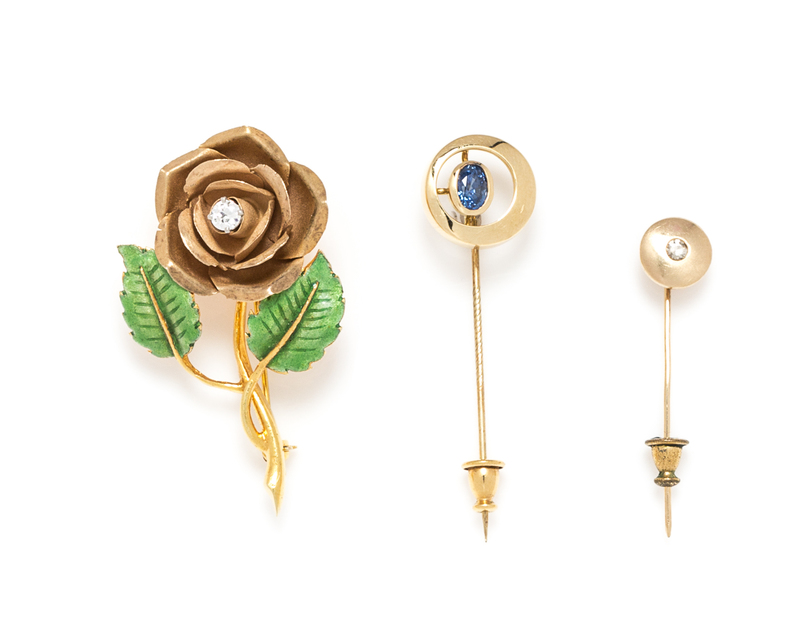 consisting of a 14 karat yellow gold rose motif brooch containing one old European cut diamond weighing approximately 0.20 carat and green enamel accents, an 18 karat yellow gold stick pin containing one oval mixed cut sapphire measuring approximately 5.96 x 4.01 mm, together with a yellow gold stick pin containing one old European cut diamond weighing approximately 0.06 carat.