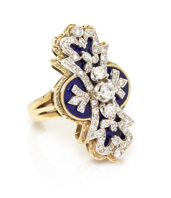 containing one round brilliant cut diamond weighing approximately 0.21 carat, two round brilliant cut diamonds weighing approximately 0.20 carat total, two round brilliant cut diamonds weighing approximately 0.05 carat total, and numerous round single cut diamonds weighing approximately 0.52 carat total set in white gold against a blue enamel background.Stamp: (obscured).