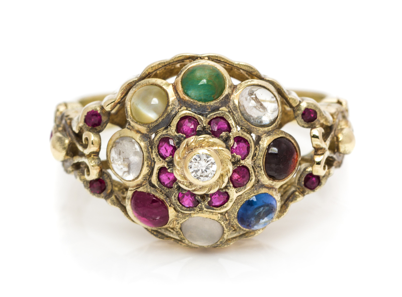 containing one round brilliant cut diamond weighing approximately 0.04 carat, eight round cabochon cut turquoise, cat's eye chrysoberyl, rock crystal, ruby, moonstone, sapphire and garnet, and 14 round mixed cut rubies.Stamp: 14K FM.
