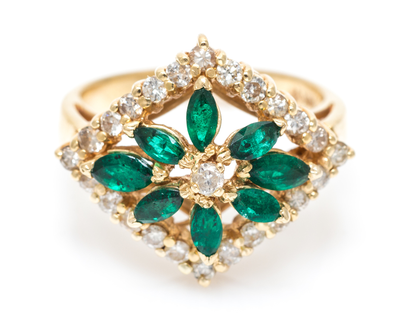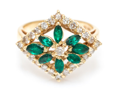 containing eight marquis cut emeralds measuring approximately 4.50 x 2.75 mm and 4.25 x 2.00 mm and 25 round brilliant cut diamonds weighing approximately 0.50 carat total. Stamp: 14K (maker's mark).