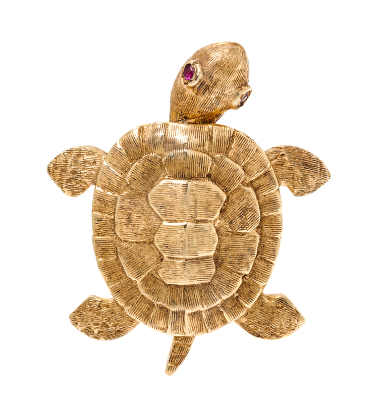 A 14 Karat Yellow Gold and Ruby Articulated Turtle Brooch,