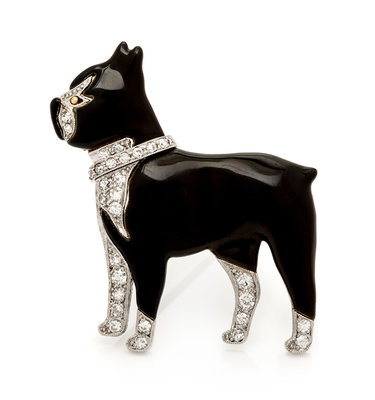 An Art Deco Platinum, Diamond and Enamel Boston Terrier Dog Brooch,