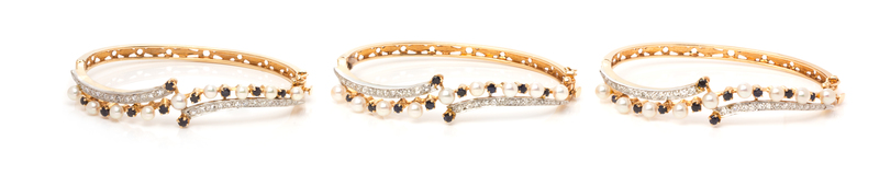 consisting of three bangles containing 27 pearls measuring approximately 4.16-4.46 mm in diameter, 84 round single cut diamonds weighing approximately 0.82 carat total, and 30 round mixed cut sapphires measuring approximately 2.35-2.20 mm in diameter.Stamp: 14K IGJRLY.