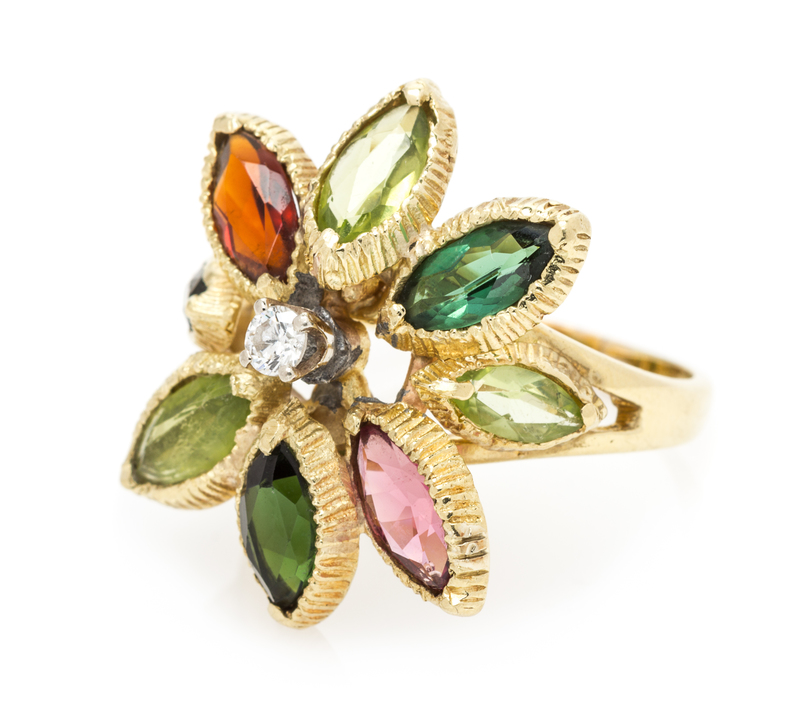 An 18 Karat Yellow Gold, Tourmaline, Peridot, Citrine and Diamond Ring,