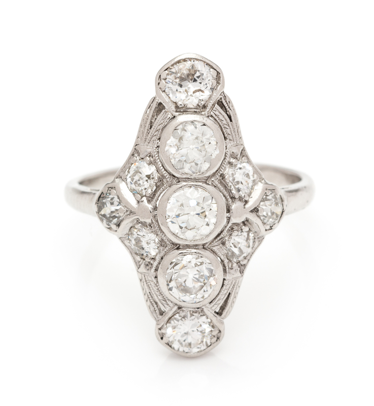 in an openwork design with millegrain and engraved detail, containing 11 old European cut diamonds weighing approximately 1.89 carats total, later white gold ring base.