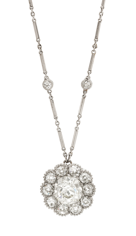 consisting of a central pendant containing one old mine cushion cut diamond weighing approximately 2.66 carats and ten old mine cut diamonds weighing approximately 2.10 carats total, suspended from a platinum bar link chain interspersed with ten bezel set old European cut diamonds weighing approximately 0.55 carats total, white gold spring ring clasp.
