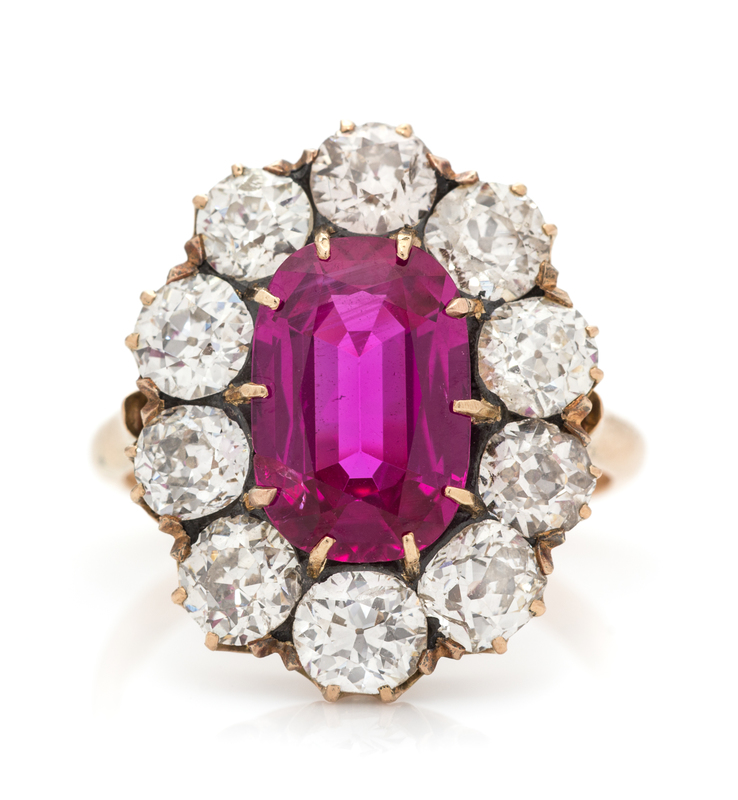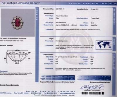containing one claw prong set oval mixed cut ruby measuring approximately 11.03 x 7.35 x 4.05 mm, and 10 old mine cut diamonds weighing approximately 2.73 carats total.Accompanied by an American Gemological Laboratories ruby identification and origin certificate number CS 44875-1, dated May 23, 2011, stating Mineral Type: Natural Corundum, Variety: Ruby, Origin: Burma (Myanmar), Enhancement: No gemological evidence of heat.