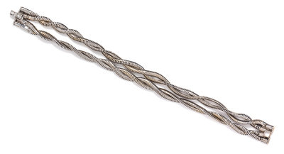 consisting of double row of twisted flat snake chain joined with a clasp containing three round brilliant cut diamonds weighing approximately 0.07 carat total.