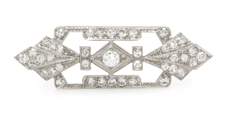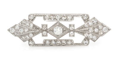 in an openwork geometric design with millegrain accents, containing one transitional brilliant cut diamond weighing approximately 0.20 carat and 40 round single cut diamonds weighing approximately 1.30 carats total. Stamp: 10% IRID. PLAT.