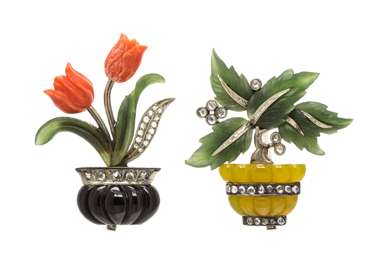 consisting of one brooch containing a melon form onyx vase with two carved nephrite leaves, two carved coral tulips on wirework stems and accented with numerous rose cut diamonds, together with a brooch containing two fluted dyed yellow chalcedony sections, four carved nephrite jade leaves and numerous rose cut diamonds.Stamp: 585.