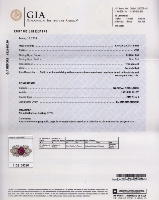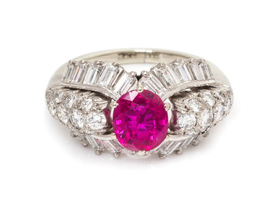 containing one oval ruby measuring approximately 8.16 x 6.75 x 4.15 mm, 22 round brilliant cut diamonds weighing approximately 0.78 carat total, and 20 baguette cut diamonds weighing approximately 1.08 carats total.Stamp: 750 (maker's mark).Accompanied by a Gemological Institute of America ruby identification and origin certificate number 1152168220, dated January 17, 2013, stating Species: Natural Corundum, Variety: Natural Ruby, Origin: Burma (Myanmar), Enhancement: No indications of heating.
