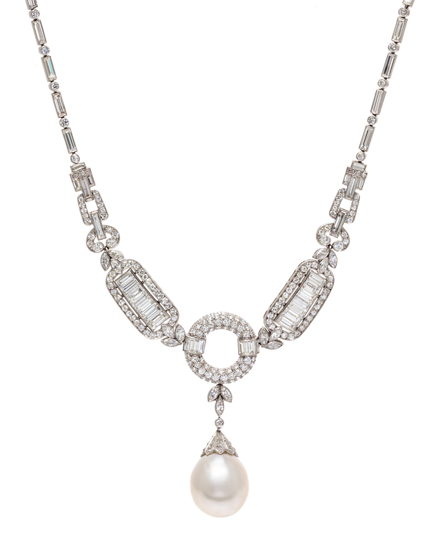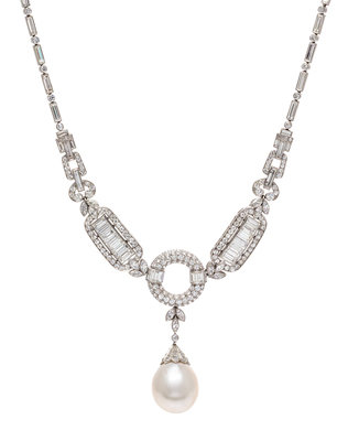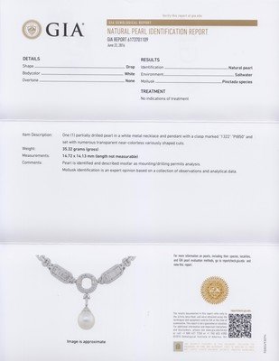 consisting of a central pendant containing one drop shape pearl measuring approximately 16.30 x 14.72 x 14.13 mm, the necklace and pendant containing 15 marquise cut diamonds weighing approximately 0.75 carat total, 61 baguette cut diamonds weighing approximately 8.53 carats total, and 193 old European cut diamonds weighing approximately 3.42 carats total. Stamp: Pt 850 1322.Accompanied by a Gemological Institute of America pearl identification certificate number 6173701109, dated June 22, 2016, stating Identification: Natural pearl, Environment: Saltwater, Mollusk: Pinctada species, Treatments: No indications of treatment.