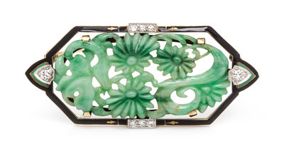 in an openwork design, the framework accented with opaque black and green enamel with raised gold details surmounted at the compass points with millegrain edged platinum accents, the brooch containing a central carved and pierced mottled green jadeite plaque, two round brilliant cut diamonds weighing approximately 0.12 carat total, and six round single cut diamonds weighing approximately 0.15 carat total.Stamp: (Maker's mark depicting an arrowhead) 14K.