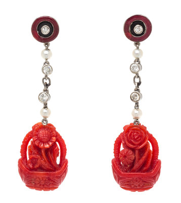 composed of two carved and pierced orangey red coral pendants in a floral basket motif measuring approximately 17.35 x 12.13 mm, the carvings suspended with cable link chain interspersed with four seed pearls and four bezel settings from circular tops accented in red and black enamel and centrally stone set, the earrings containing six old European and transitional brilliant cut diamonds weighing approximately 0.27 carat total.