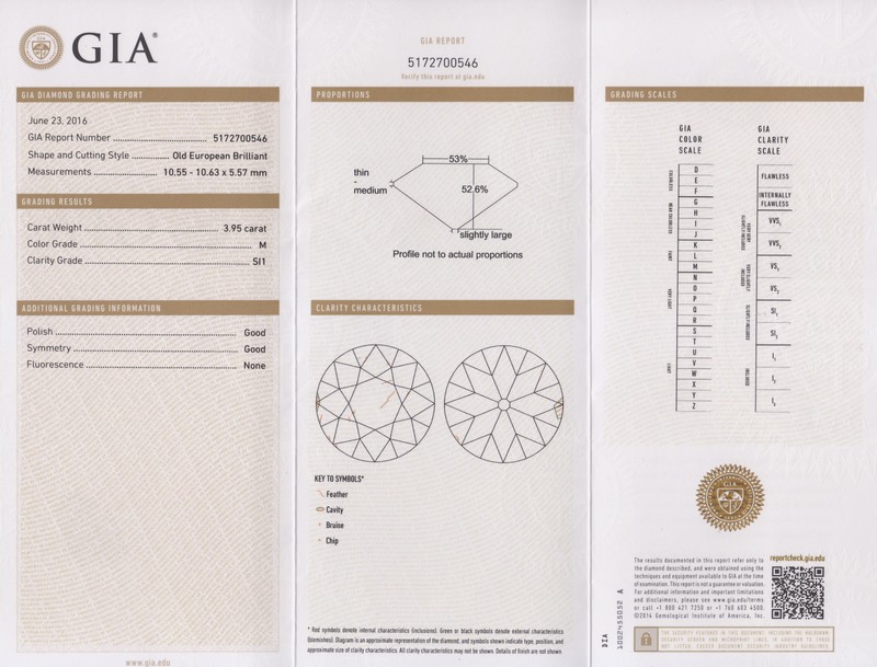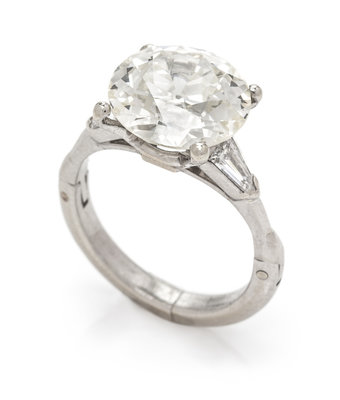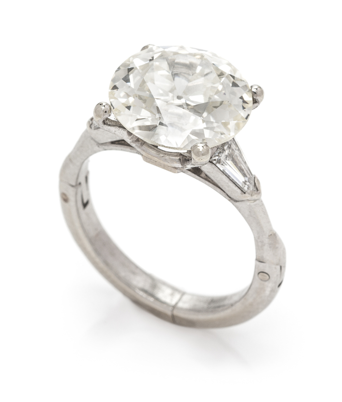 containing one old European cut diamond weighing approximately 3.95 carats, and two tapered bullet cut diamonds weighing approximately 0.28 carat total, hinged ring base.Accompanied by a Gemological Institute of America diamond grading certificate number 5172700546, dated June 23, 2016, stating Color: M, Clarity: SI1, Table: 53.00%, Depth: 52.60%, Polish: Good, Symmetry: Good, Fluorescence: None.